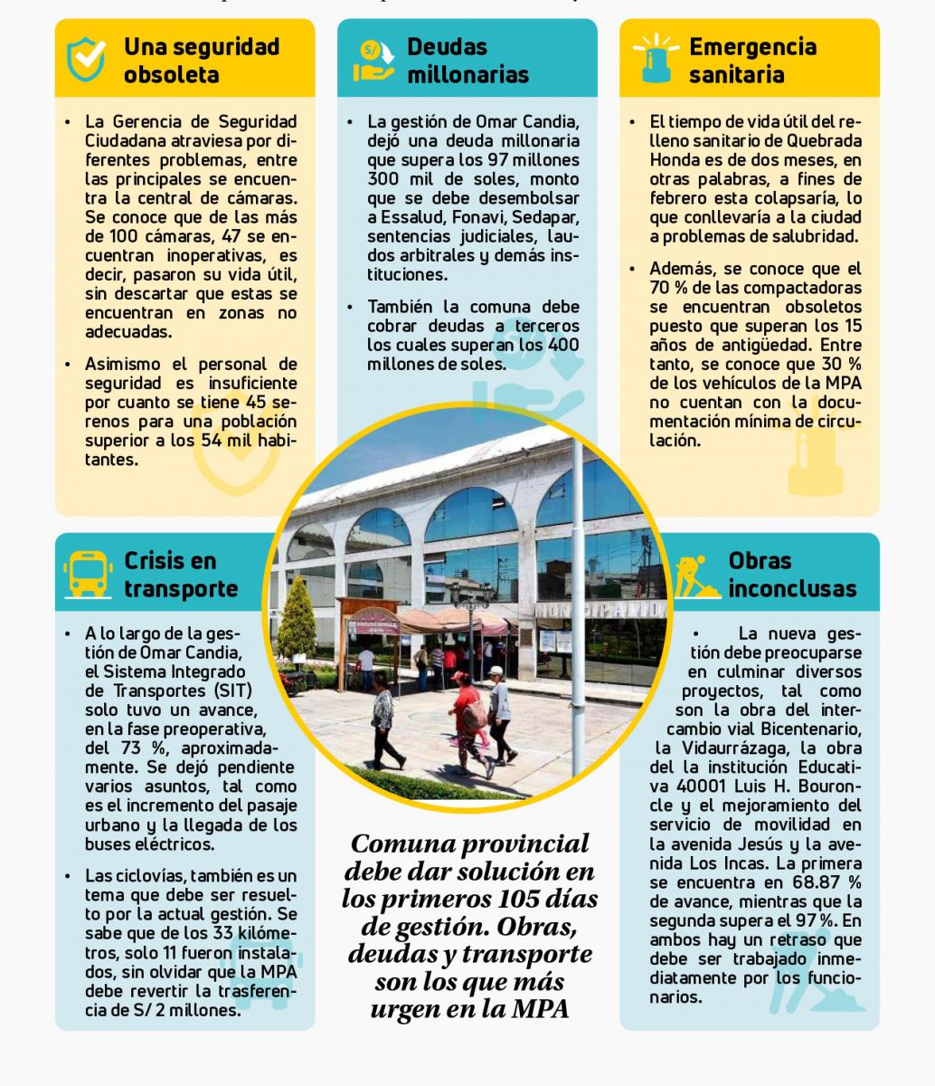 La nueva gestión de la Municipalidad Provincial de Arequipa (MPA) inicia con un sinfín de problemas dejadas por la gestión saliente Omar Candia-Ángel Linares. Desde obras inconclusas, como el intercambio vial Bicentenario hasta deudas millonarias, exceso de personal, posibilidad de prescribirse papeletas, incumplimiento de contratos del SIT y otros.