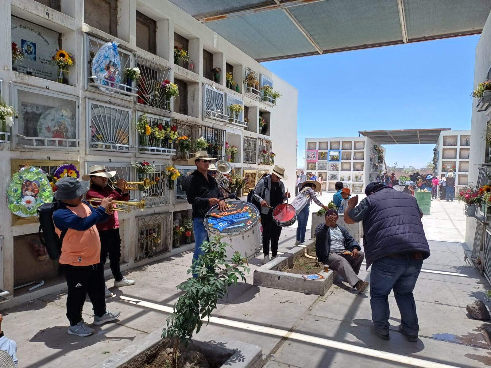 Germán García murió hace tres años, víctima de una herida gangrenada en la pierna derecha y su cuerpo descansa en el cementerio Paz Eterna, situado en el sector Ciudad Municipal del distrito de Cerro Colorado. Hasta ahí, en el Día de Todos los Santos, arribaron sus dos mejores amigos, Lucrecio Mamani (48) y Nicolás Pocco (56), para visitar su nicho y recordarlo escuchando un par de pasodobles folclóricos, una de las músicas favoritas del finado. Para ello, solicitaron los servicios de Edson Ranilla (26) y su banda ‘Revelación Star’, quienes recorrían, con tambor, bombo, trompeta y bajo, por los pasadizos de los pabellones de la zona izquierda baja del recinto. Es el segundo año consecutivo que la banda acude al camposanto más grande del Cono Norte, pero el sexto de su constitución como agrupación que ayer, puso a bailar y sollozar a decenas de familias.