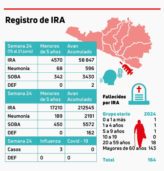 Durante el primer semestre del año, fallecieron 162 pacientes mayores de cinco años y más dos pacientes menores de cinco años con IRA de enero a la fecha. De los 164 pacientes, el 80 % son adultos mayores que perdieron la vida con las IRA.