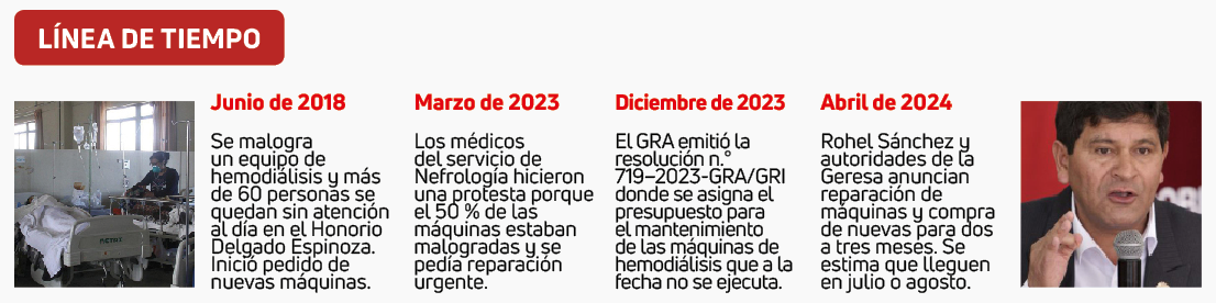 Como se sabe, de los 31 equipos de hemodiálisis que tiene el conocido nosocomio regional, solo 7 se encuentran operativos y la totalidad ya superó los 10 años de antigüedad, pese a que la vida útil es de 8 años. De otro lado, en diciembre 2023, mediante resolución n.° 719–2023-GRA/GRI, se aprueba la ficha de mantenimiento que tardó en ejecutarse más de 6 meses. Aparte existe otro proyecto de compra de máquinas nuevas que a la fecha no ve luz verde, este llegaría en el mejor de los casos para agosto del 2024.