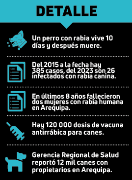 Además, en la región Arequipa hay 12 mil canes con dueños, por ello el especialista Gonzales pidió a los propietarios que si ven a sus mascotas con síntomas como que el perro se esconde en un rincón, deben acudir a los centros de salud.