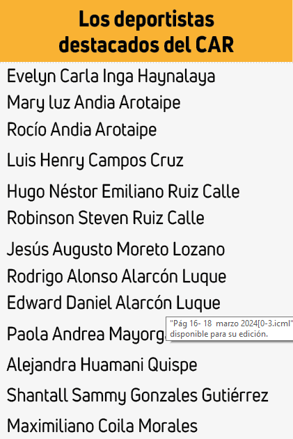 Mientras que los deportistas Mary Andia, Luis Campos, Paula Mayorga, Shantal Gonzales, Hugo Ruiz, Alejandra Huamaní, Maximiliano Coila, Robinson Ruiz, Edwar Alarcón, Rodrigo Alarcón y Jesús Moreno obtuvieron importantes resultados en torneos nacionales, panamericanos y sudamericanos.