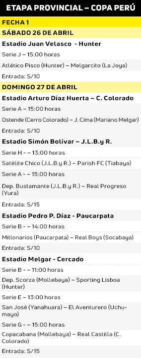 Con el partido entre Atlético Pisco de Hunter y Melgarcito de La Joya (15:00 horas), este sábado rompe fuegos la etapa provincial de la Copa Perú. Esta partido es correspondiente al grupo J.