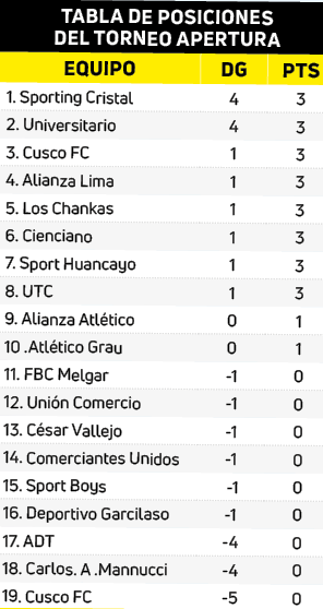En otros duelos, UTC batió 1-0 a Deportivo Garcilaso, Sport Huancayo se impuso 1-0 a Sport Boys, Cienciano ganó a Comerciantes Unidos por igual marcador y Atlético Grau igualó 1-1 contra Alianza Atlético.