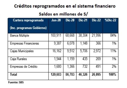 El total de créditos reprogramados en el sistema financiero, incluyendo los programas de Gobierno, de los clientes perjudicados por la pandemia del covid-19 ascendió a 26,095 millones de soles a diciembre del 2022, saldo que continuó su tendencia a la baja, mostrando una reducción de 43.7% y 23.6% respecto a diciembre del 2021 y junio del 2022 respectivamente, informó la Superintendencia de Banca, Seguros y AFP (SBS).