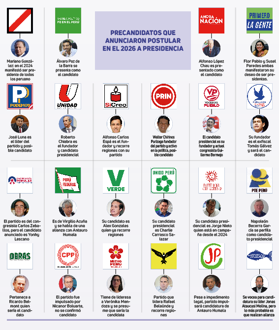 Mientras que algunos precandidatos ya anunciaron su decisión de disputar el cargo de jefe de Estado, otros viajan con sus partidos a diferentes regiones del país. Es el caso de Alfonso López, rector de la Universidad Nacional de Ingeniería, quien es el postulante por Ahora Nación y visitó Cusco u otros lugares. Del mismo modo, el actual parlamentario Roberto Chiabra, quien logró inscribir su partido Unidad y Paz, llegó a Arequipa, pero sin su partido.
