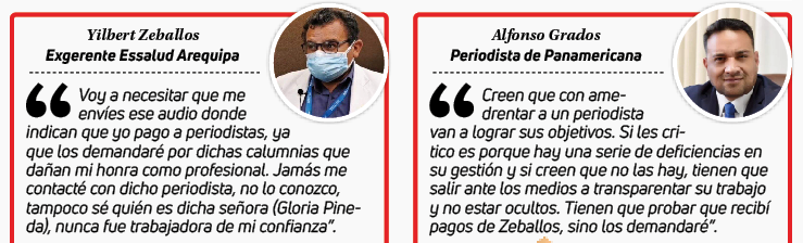 ATEMORIZAR A PERIODISTAS. En otro fragmento de la conversación se escucha a Renzo Pacheco y Julio Cervantes pedirle a Gloria Pineda gestionar una millonaria querella contra el periodista Alfonso Grados (Panamericana), ya que dicho profesional increparía el actuar de los funcionarios de Essalud.