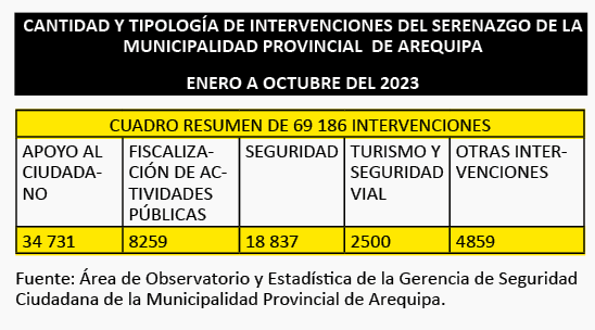INTERVENCIONES. De enero a octubre de este año, el personal de serenazgo de la comuna provincial ha realizado 69 186 intervenciones en varios ámbitos.