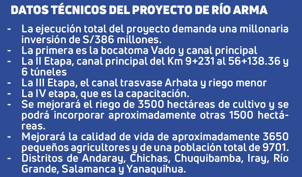 El proyecto del río Arma es uno de los más grandes de la provincia de Condesuyos. Su objetivo es irrigar más de 3 mil hectáreas de cultivos y optimizar la economía de los pobladores. En el 2019, el Gobierno Regional de Arequipa (GRA) aprobó su viabilidad y hasta el 13 de diciembre del 2023, solo se instalaron una parte de las tuberías de manera irregular.