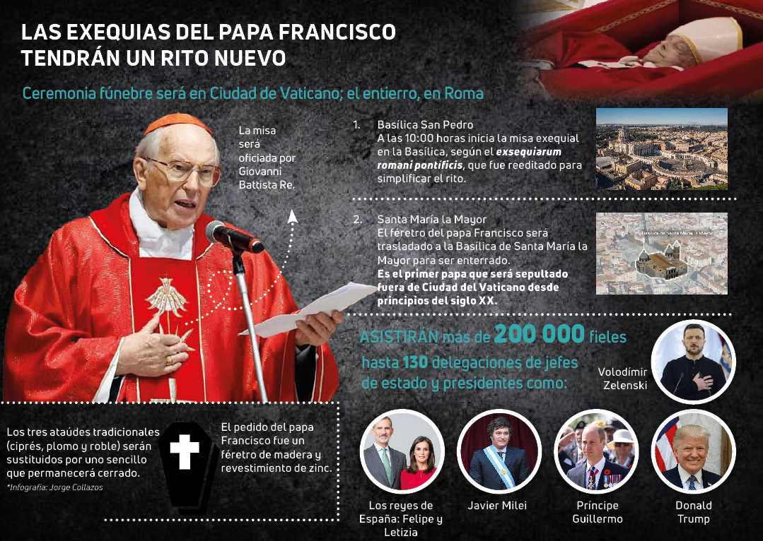 La tradición del funeral del sumo pontífice tiene siglos de historia, pero ese rito solemne cambiará este sábado 26 de abril ante los ojos de la jerarquía eclesial, de hasta 130 delegaciones de jefes de Estado y Gobierno, de 200 000 fieles que asistirán en diferido al funeral del papa Francisco, fallecido el lunes a los 88 años (ver infografía).