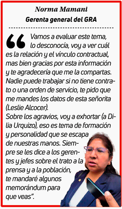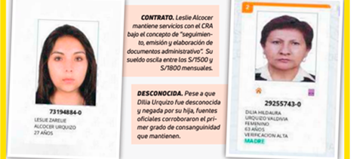 Dilia Urquizo Valdivia es jefa de la Oficina de Recursos Humanos del Gobierno Regional de Arequipa (GRA). Su cargo es llamado a dar el ejemplo respecto a la transparencia en temas laborales y contractuales, pero la funcionaria permite que su hija Leslie Alcocer Urquizo, labore en la misma entidad en donde su madre ocupa un alto cargo de confianza, vulnerando la Ley de Contrataciones con el Estado.