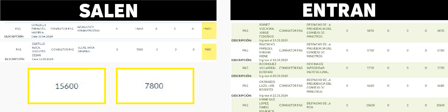 Los nuevos beneficiados de esta modalidad contractual son: Jorge Ibáñez Vizcarra e Irene Palomino Paredes (consultores despacho PCM), Estefany Rodríguez Villareal (consultor Oficina de Integridad Institucional) y Roberto Carrasco Lazo (consultor despacho de PCM). Los salientes fueron: Mariela Gonzales Espinoza (consultor Secretaría Administrativa) y Augusto Castillo Roca (consultor en Secretaría General).