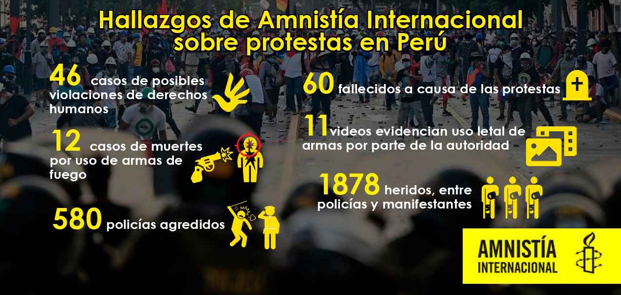 “Las autoridades peruanas permitieron que, durante más de dos meses, el uso excesivo y letal de la fuerza sea la única respuesta del gobierno ante el clamor social de miles de comunidades que hoy exigen dignidad y un sistema político que garantice sus derechos humanos”, dijo la representante de la organización, Erika Guevara Rosas.