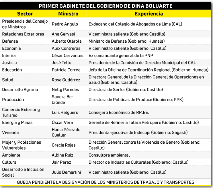 Lima. Tal y como lo anunció la flamante presidenta Dina Boluarte, este 10 de diciembre tomó juramento a su nuevo gabinete con el que trabajará. Como nuevo premier fue designado Pedro Angulo Arana y en las diferentes carteras están ocho mujeres, aún falta juramentar a los ministerios de Trabajo y Promoción del Empleo; y Transportes y Comunicaciones. (Ver tabla al final)