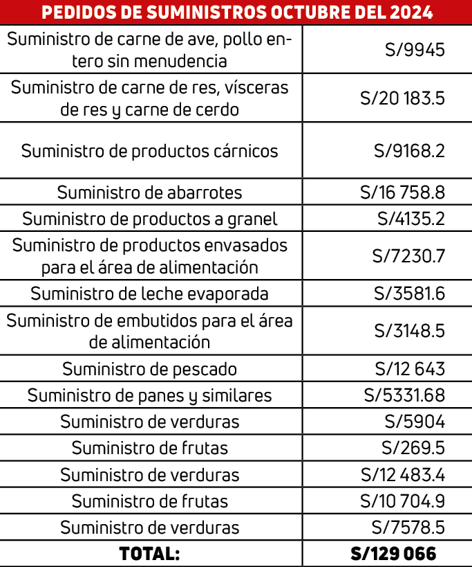 Los precios de los pedidos varían desde S/269 en frutas hasta S/20 mil en de carne de res y cerdo (ver cuadro de suministros). Lo que da un total de más de S/129 mil en un solo mes, dividiendo entre los 31 días sale un promedio de S/4 mil, que se gastaría en alimentos en un solo día.