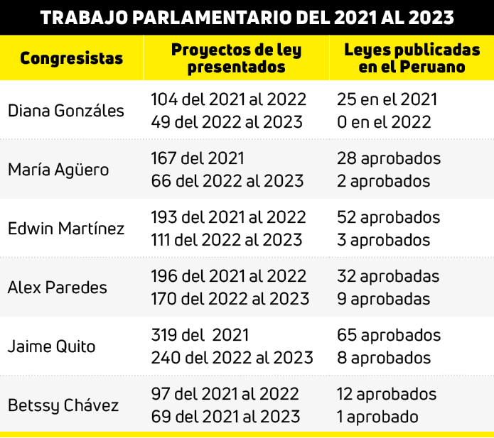 Arequipa es representado por cinco congresistas: Diana Gonzáles (Avanza País), María Agüero (Perú Libre), Jaime Quito (Perú Libre), Edwin Martínez (Acción Popular) y Alex Paredes (Bloque Magisterial). De los cinco parlamentarios la que tiene menos productividad es Gonzales, quien durante su período legislador presentó 153 proyectos de ley, de ellos 25 fueron aprobados en el 2021 y del 2022 hasta la fecha no tiene ninguna propuesta publicada en El Peruano. Si comparamos con la congresista por Tacna, Betssy Chávez, quien fue criticada por tener solo una ley aprobada este año, Diana Gonzáles le gana en improductividad pues ella no tiene ninguna. (Ver cuadro)