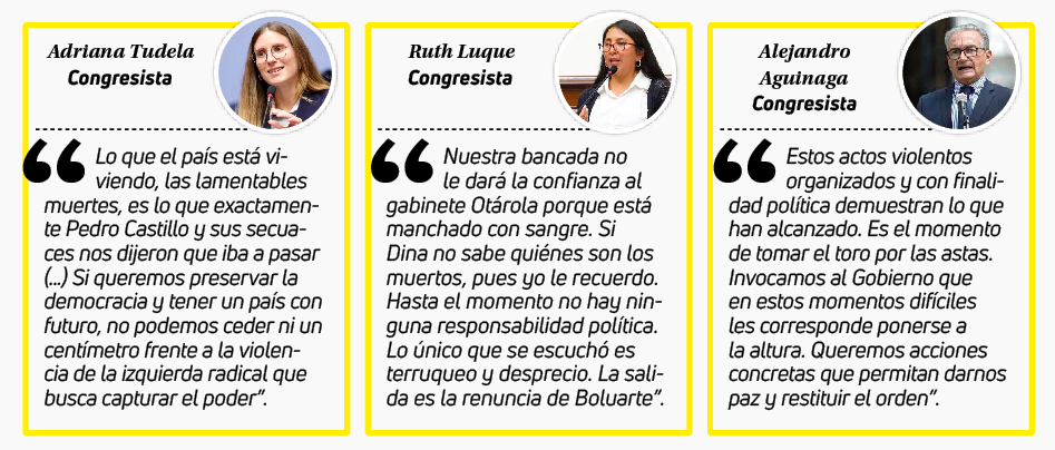 Mientras que unos continuaban con los ataques al gabinete calificándolo de asesino a gritos. Otros parlamentarios saludaban la posición del premier, apoyando su posición de culpar a la izquierda radical mencionaban y sobre todo al expresidente Pedro Castillo.